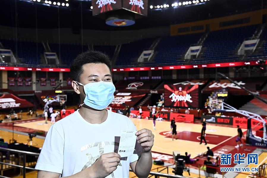 7月26日,在青島國信體育館,蘇柯帆展示著自己的紙質球票。他成為CBA聯賽復賽允許觀眾現場觀賽后,首位進場的觀眾。 當日,在山東青島舉行的2019-2020賽季中國男子籃球職業聯賽(CBA)復賽第二階段(嶗山賽區)比賽中,醫護人員、教師、公安戰線人士通過官方購票平臺,完成包括核酸檢測在內的相關流程后進場觀看了上海久事隊迎戰山東西王隊的比賽。 觀賽期間,觀賽者須全程佩戴口罩,對號入座,嚴格保持間隔一米就座。退場時,觀眾須按照自后向前、先兩邊后中間的順序,保持“一米線”社交距離有序退場。 新華社記者 郭緒雷 攝