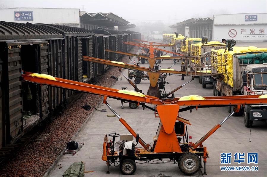 在中國鐵路鄭州局集團(tuán)有限公司開封車站,工作人員使用傳輸機(jī)裝運(yùn)春耕物資(2月13日攝)。 新華社記者 李安 攝