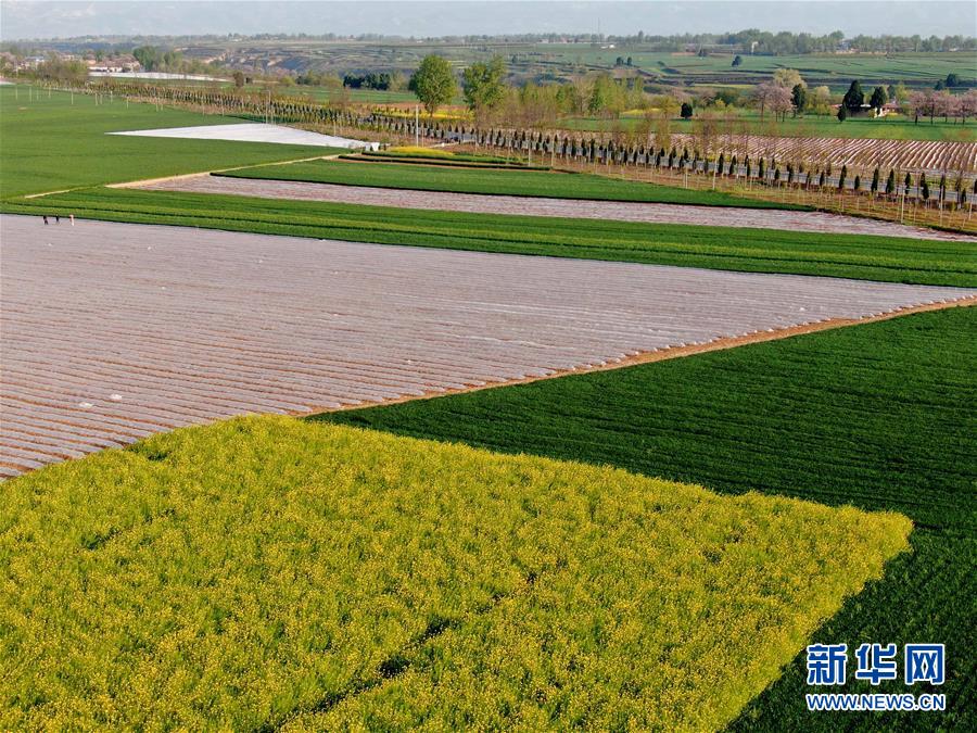 這是洛陽市洛寧縣小界鄉(xiāng)一處油菜、西瓜、小麥間種的農(nóng)田(4月13日攝,無人機(jī)照片)。 新華社記者 李安 攝