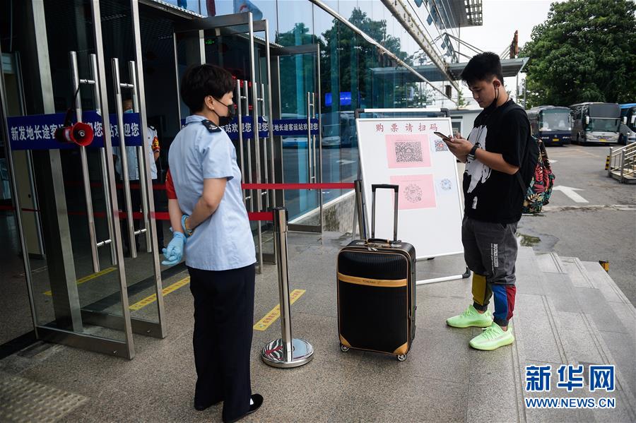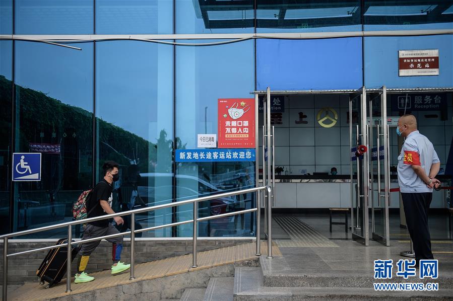 7月26日,一名乘客(左)來到北京新發地長途客運站。 在做好各項疫情防控措施的前提下,北京新發地長途客運站于7月26日起恢復營運。 新華社記者 彭子洋 攝