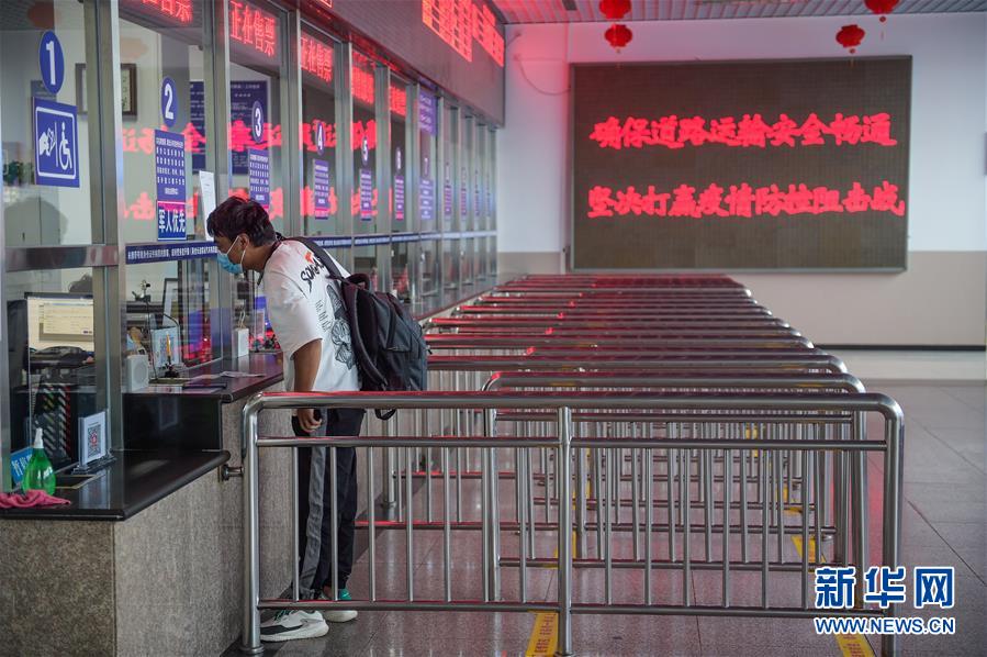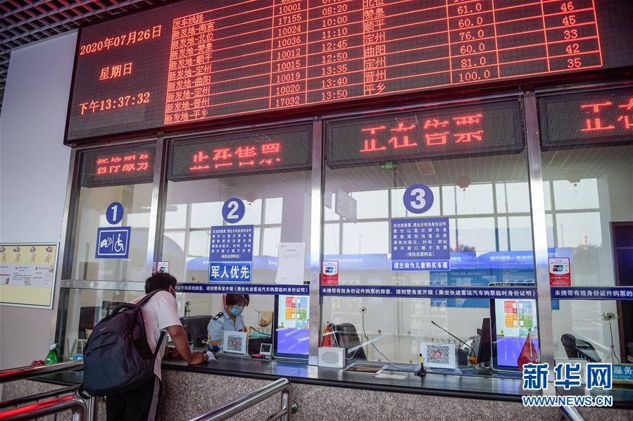 7月26日,一名乘客在北京新發地長途客運站的售票窗口購票。 在做好各項疫情防控措施的前提下,北京新發地長途客運站于7月26日起恢復營運。 新華社記者 彭子洋 攝