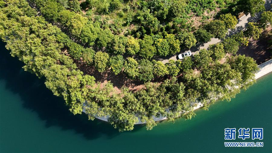 7月26日,汽車行駛在欒卸村的樹林里(無人機照片)。 盛夏,位于太行山區的河北省沙河市欒卸村滿目蔥蘢,山水、田園、民居構成一幅美麗鄉村圖景。 新華社記者 牟宇 攝