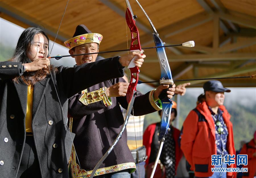 一名游客在當?shù)剞r(nóng)牧民的指導(dǎo)下射擊響箭(7月26日攝)。 新華社記者 張汝鋒 攝