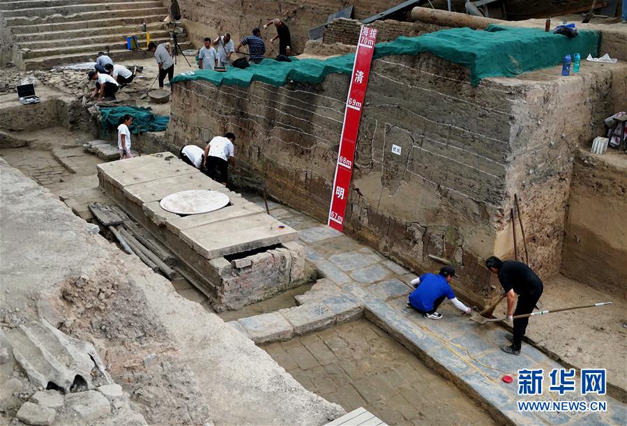 工作人員在河南省開封市州橋及附近汴河遺址進行清理發(fā)掘(7月27日攝)。新華社記者 李安 攝 州橋遺址位于今河南省開封市中山路與自由路十字路口南約50米。據記載,州橋建造年份可追溯到唐代建中年間(780—783年),后經五代、宋、金、元、明,1642年被黃河泛濫泥沙淤埋。1984年被偶然發(fā)現(xiàn)后,進行了局部試掘。