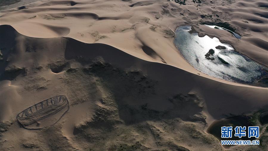 這是7月28日拍攝的青海湖沙島一隅(無人機照片)。 盛夏傍晚,位于青海湖東北部的沙島,島內湖泊星羅棋布,沙丘連綿起伏,風景別致。金沙與湖水掩映,在陽光的勾勒下形成一幅美麗的畫卷。 新華社記者 吳剛攝