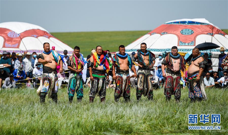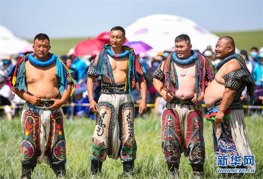 8月2日,搏克手準備進行搏克比賽。 當日,錫林浩特市游牧文化節·白音錫勒牧場建場70周年那達慕在錫林浩特市白音錫勒牧場拉開帷幕。賽馬、搏克、射箭等蒙古族傳統項目吸引游客前來觀看。 新華社記者 連振 攝