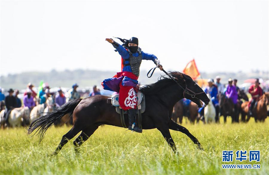 8月2日,民族馬術表演者在開幕式上進行表演。 當日,錫林浩特市游牧文化節·白音錫勒牧場建場70周年那達慕在錫林浩特市白音錫勒牧場拉開帷幕。賽馬、搏克、射箭等蒙古族傳統項目吸引游客前來觀看。 新華社記者 彭源 攝
