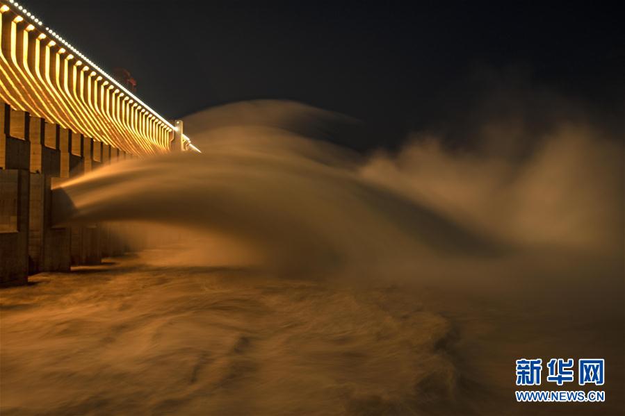 7月31日晚拍攝的三峽大壩泄洪景象。 入夜,三峽工程景觀燈開(kāi)放,整個(gè)景區(qū)更加壯麗多彩。 新華社記者 杜華舉 攝