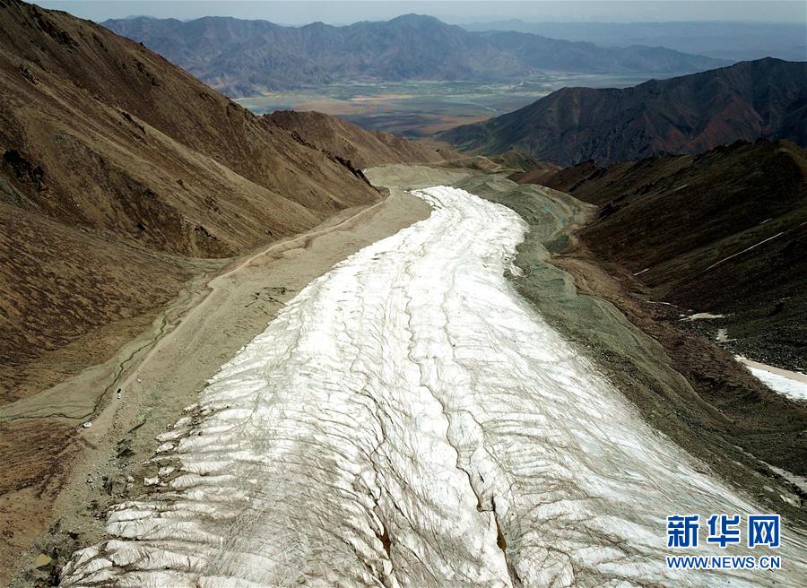 這是8月3日拍攝的透明夢柯29號冰川一景(無人機照片)。 位于甘肅省酒泉市肅北蒙古族自治縣黨城灣鎮的透明夢柯29號冰川宏偉壯麗,氣勢磅礴。 新華社記者 郭剛 攝