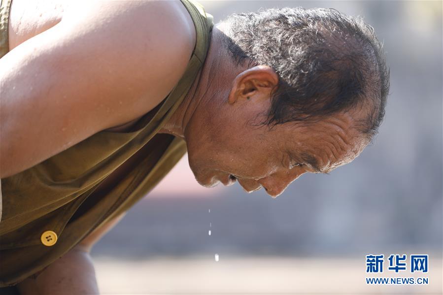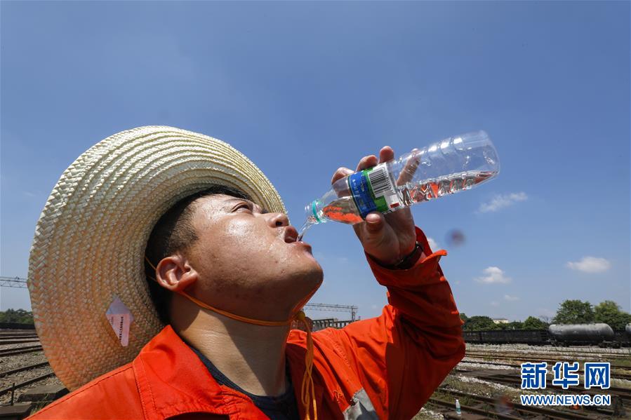 8月4日,一名鷹潭工務(wù)機(jī)械段的工作人員飲水解渴。 新華社記者 胡晨歡 攝