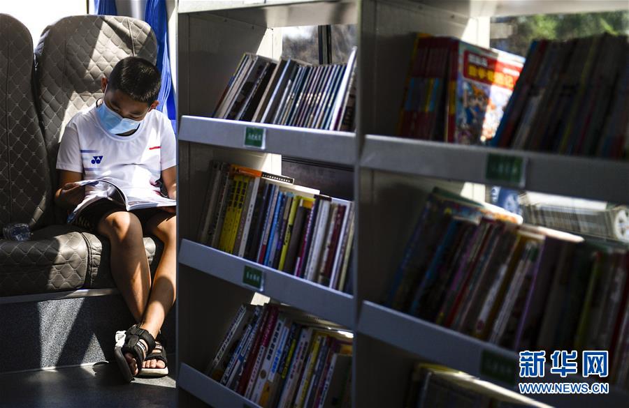 8月5日,一名小讀者在“流動圖書館”里看書。 三千冊圖書,一輛大巴車,穿梭在城市的街頭巷尾。在吉林長春,長春市圖書館利用流動圖書車,定期在市內15個固定服務點間巡回流動,為市民提供便捷的圖書借閱服務。 新華社記者 許暢 攝
