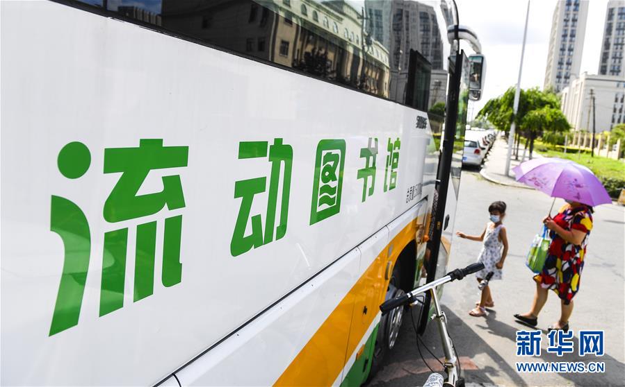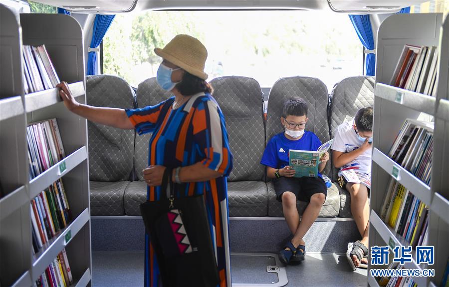 8月5日,在長春市一處社區服務點,市民進入“流動圖書館”借閱圖書。 三千冊圖書,一輛大巴車,穿梭在城市的街頭巷尾。在吉林長春,長春市圖書館利用流動圖書車,定期在市內15個固定服務點間巡回流動,為市民提供便捷的圖書借閱服務。 新華社記者 許暢 攝