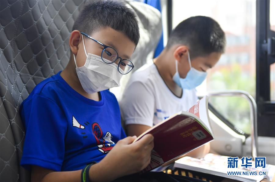 8月5日,小讀者在“流動圖書館”里看書。 三千冊圖書,一輛大巴車,穿梭在城市的街頭巷尾。在吉林長春,長春市圖書館利用流動圖書車,定期在市內15個固定服務點間巡回流動,為市民提供便捷的圖書借閱服務。 新華社記者 許暢 攝