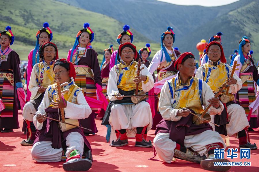 8月7日,在西藏首屆弦子舞展演現場,演出人員在表演弦子舞。 當日,西藏首屆弦子舞展演在昌都市芒康縣舉行。眾多演員同臺獻藝,表演國家級非物質文化遺產弦子舞,吸引西藏各地的群眾前來觀看。 新華社記者 孫非 攝