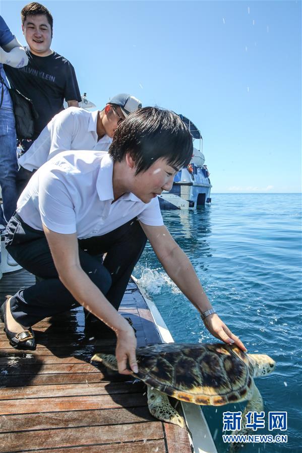 8月9日,在海南陵水縣分界洲島附近海域,志愿者在放流海龜。 當日,2020年南海海龜放流活動在海南省陵水黎族自治縣分界洲島附近海域舉行,99只救治康復(fù)海龜被放歸大海。 據(jù)了解,本次放歸的99只海龜,分別來自執(zhí)法機關(guān)罰沒和誤捕擱淺救助,均已經(jīng)過專業(yè)機構(gòu)妥善救治和野化訓練,具備野外生存能力,其中10只海龜放置了定位追蹤芯片,通過追蹤海龜?shù)匿в温窂剑私夂}斏盍曅约皸⒌厣鷳B(tài)環(huán)境。 新華社記者 張麗蕓 攝