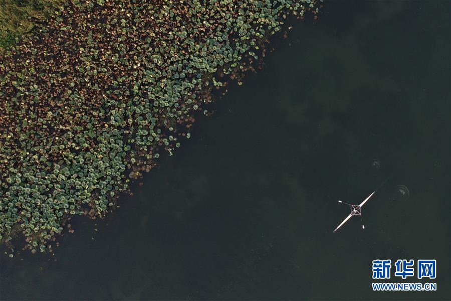 一艘皮劃艇從杭州西湖景區的一處荷花池附近經過(2019年10月29日攝,無人機照片)。 新華社記者 黃宗治 攝