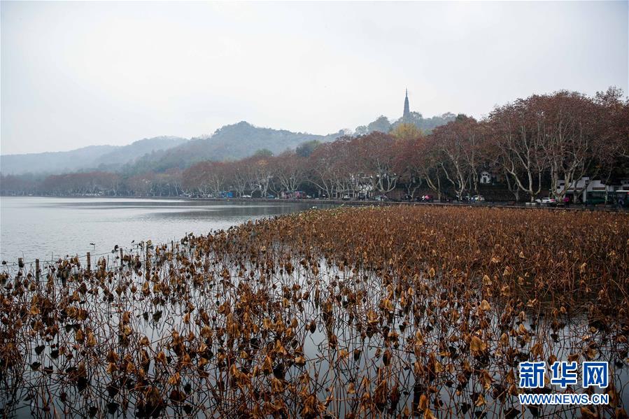 殘荷迎初雪,遠處保俶塔云霧迷蒙(2018年12月8日攝)。 新華社記者 殷曉圣 攝