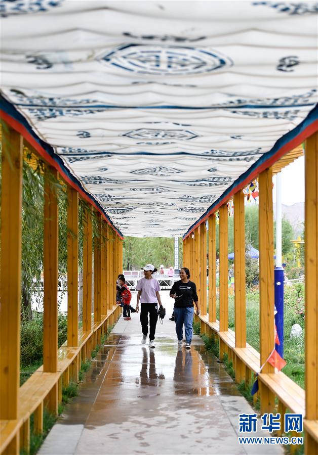 8月11日,游客在尖扎縣昂拉鄉德吉村景觀長廊內游玩。 新華社記者 張龍 攝