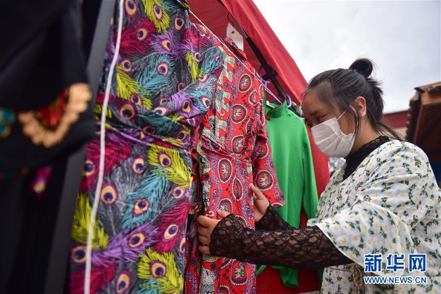 8月11日,尖扎縣昂拉鄉德吉村村民在自家經營的藏裝店內整理服裝。新華社記者 張龍 攝
