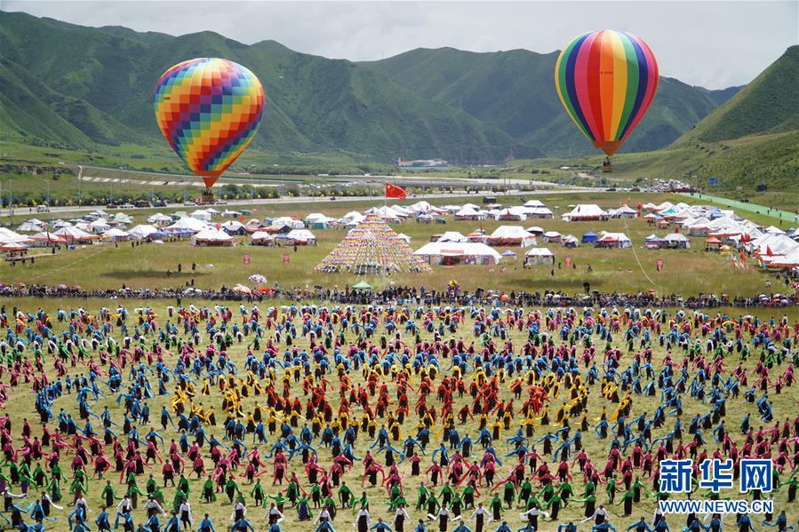 8月12日,身著節日盛裝的演員和當地群眾在夏澤灘草原上跳起鍋莊舞。 當日,2020中國碌曲鍋莊舞展演暨甘南藏族自治州第六屆少數民族傳統體育運動會在甘肅省甘南州碌曲縣夏澤灘草原上舉行。開幕式上,三千余名身著節日盛裝的演員和當地群眾在草原上起舞,雨后初晴的草原上充滿歡聲笑語。 新華社記者 黃澤民 攝