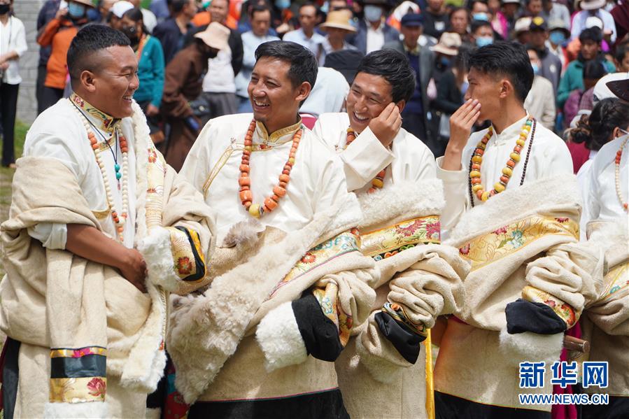 8月12日,演員在開幕式現場準備演出。 當日,2020中國碌曲鍋莊舞展演暨甘南藏族自治州第六屆少數民族傳統體育運動會在甘肅省甘南州碌曲縣夏澤灘草原上舉行。開幕式上,三千余名身著節日盛裝的演員和當地群眾在草原上起舞,雨后初晴的草原上充滿歡聲笑語。 新華社記者 黃澤民 攝