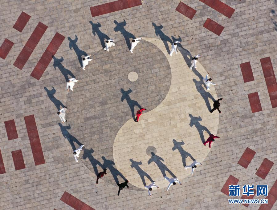 太極拳愛好者在河北省邯鄲市永年區太極小鎮習練太極拳(無人機照片,12月16日攝)。新華社發