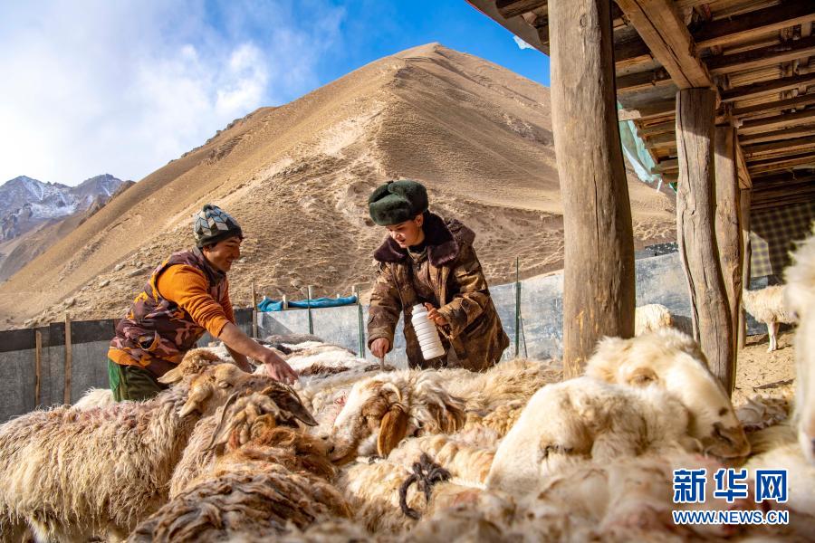 古再麗·艾依迪爾(右)在葉城二牧場三連幫助牧民給羊群做標記(2020年12月27日攝)。 新華社記者 胡虎虎 攝