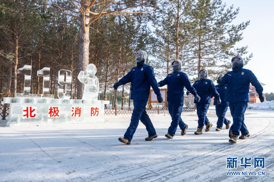 1月13日,漠河市北極村消防救援站站長鄭樹君(右一)和消防員們在北極村進行室外耐寒訓練。新華社記者 謝劍飛 攝