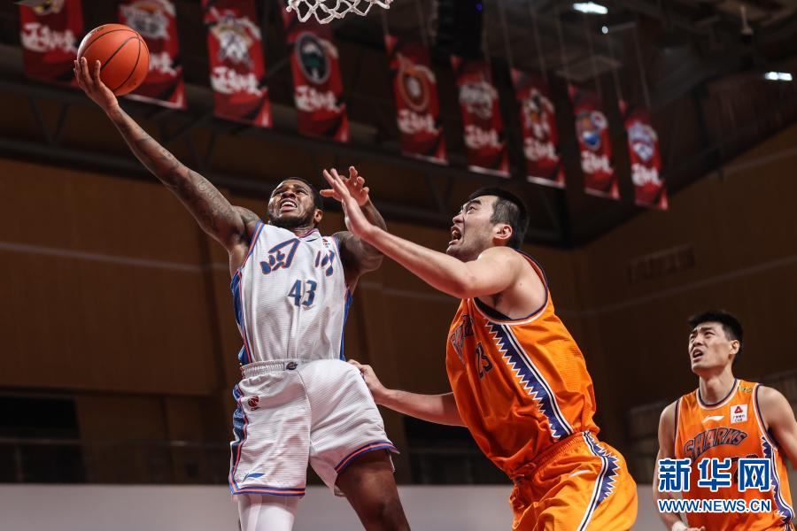 1月25日,四川五糧金樽隊球員亨特(左)在比賽中上籃。 當日,在浙江諸暨進行的2020-2021賽季中國男子籃球職業聯賽(CBA)第二階段第34輪比賽中,四川五糧金樽隊經過雙加時以136比129戰勝上海久事隊。 新華社記者 潘昱龍 攝