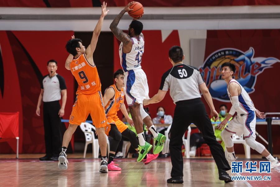 1月25日,四川五糧金樽隊球員亨特(左二)投進三分球,將比賽拖進第二個加時。 當日,在浙江諸暨進行的2020-2021賽季中國男子籃球職業聯賽(CBA)第二階段第34輪比賽中,四川五糧金樽隊經過雙加時以136比129戰勝上海久事隊。 新華社記者 潘昱龍 攝