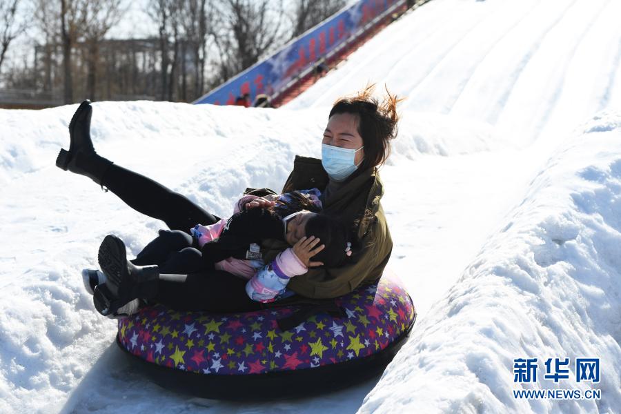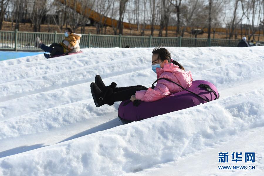 2月6日,市民們在北京歡樂水魔方嬉水樂園體驗“雪地飛碟”。 春節將至,市民來到北京歡樂水魔方嬉水樂園,參加第六屆歡樂水魔方冰雪嘉年華活動,體驗“雪地飛碟”、冰滑梯等冰雪游樂項目,樂享冬日美好時光。 新華社記者 任超 攝