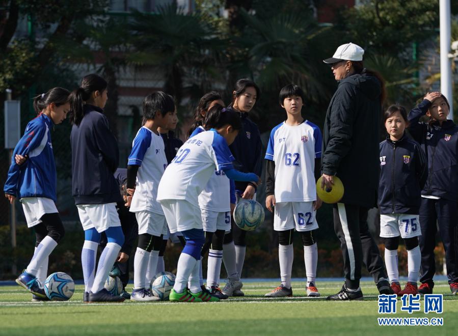 上海市梅隴中學女子足球隊教練錢惠(前)在訓練中指導隊員(2月4日攝)。 新華社記者 丁汀 攝