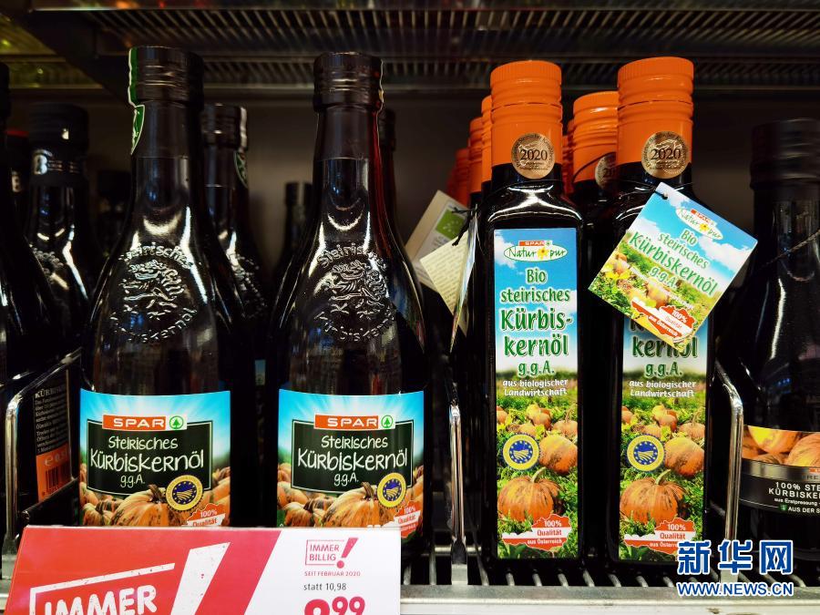 這是3月2日在奧地利維也納商店內拍攝的施泰爾南瓜籽油。奧地利的施泰爾南瓜籽油是中歐地理標志協定中首批受保護的歐盟地理標志產品。 中歐地理標志協定3月1日起生效。首批“上榜”的中歐各100個地理標志即日起受到保護,這意味著中國和歐盟的更多特色優質名品將進入彼此市場,不僅將更好保護中歐企業權益,也會讓雙方消費者買得放心。 新華社記者 郭晨 攝