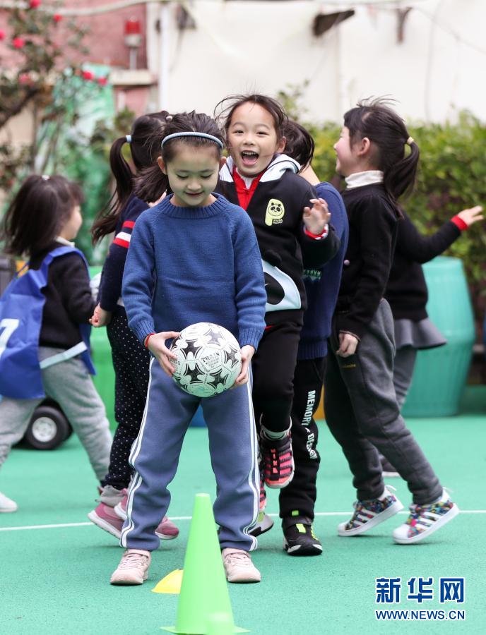 3月9日,上海市徐匯區科技幼兒園的小朋友在進行足球趣味練習。
