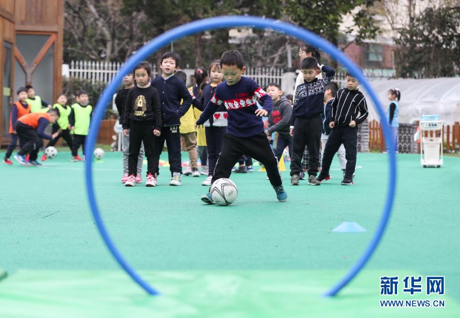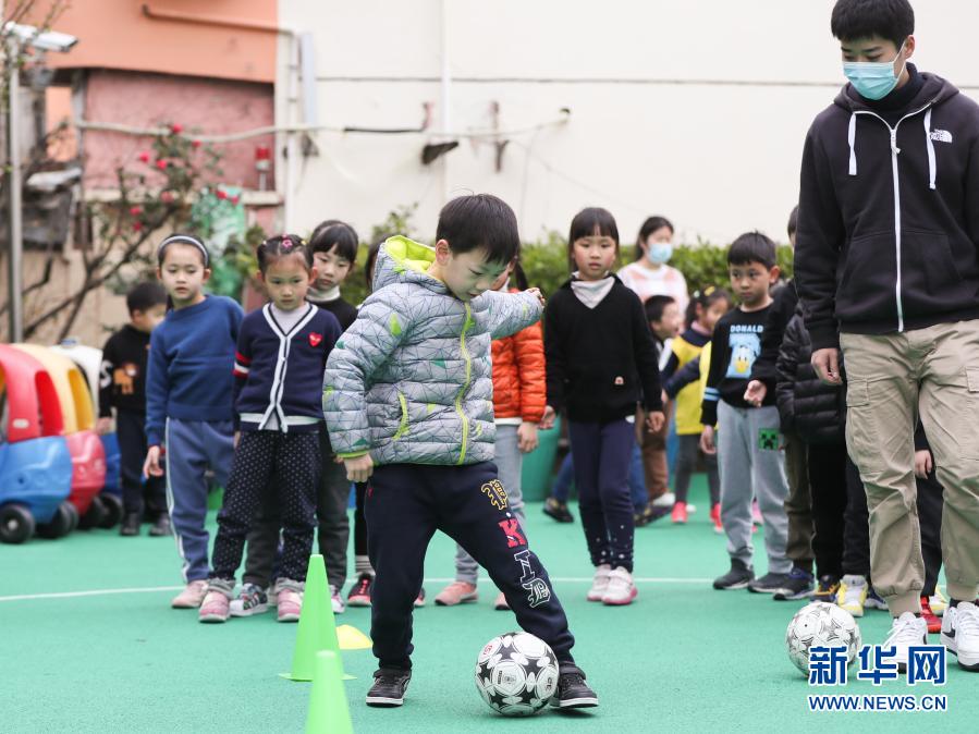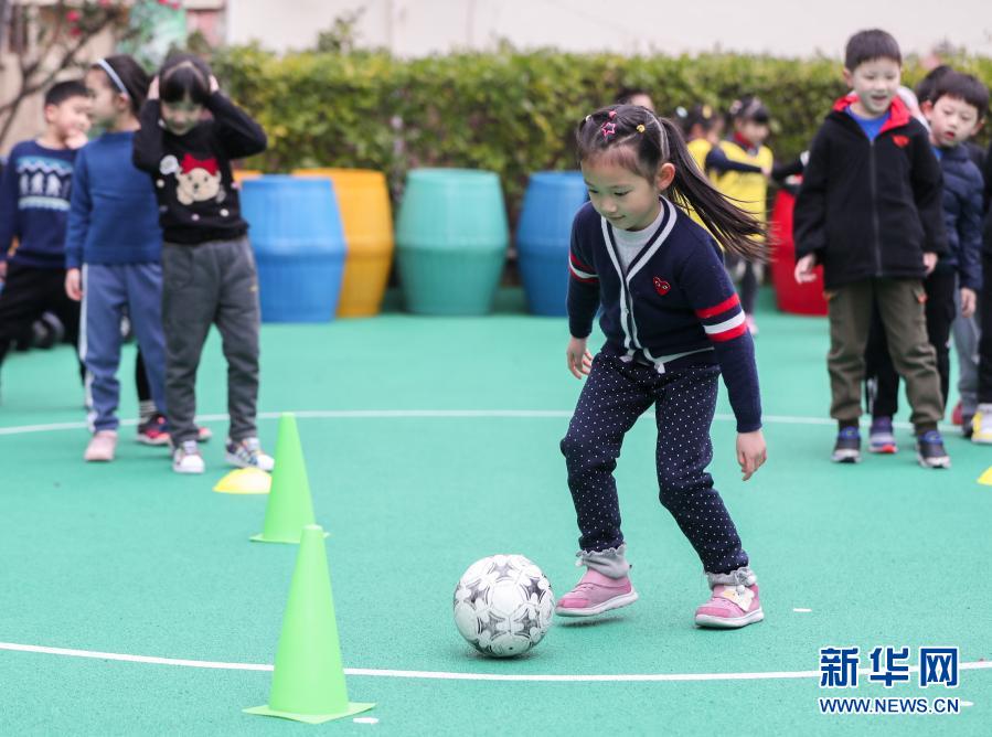 3月9日,上海市徐匯區科技幼兒園的小朋友在進行足球趣味練習。 上海市徐匯區科技幼兒園引入校外足球教育資源,開設“娃娃足球課”,通過足球趣味練習、足球游戲等,培養孩子們的足球興趣。 新華社記者 丁汀 攝