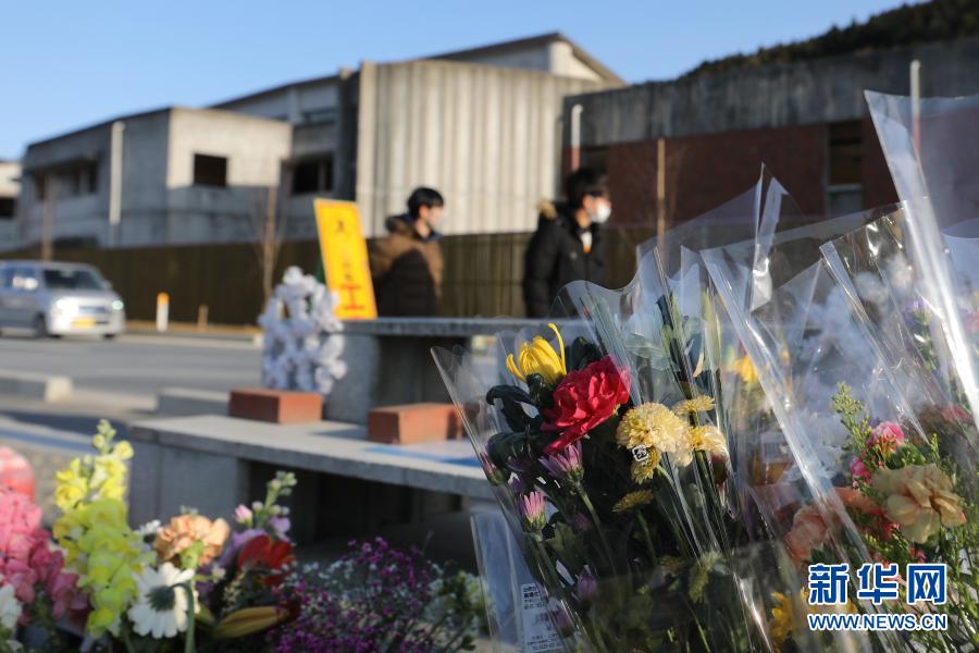 這是3月9日在日本宮城縣石卷市大川小學(xué)遺址前拍攝的人們獻上的悼念花束。新華社記者 杜瀟逸 攝