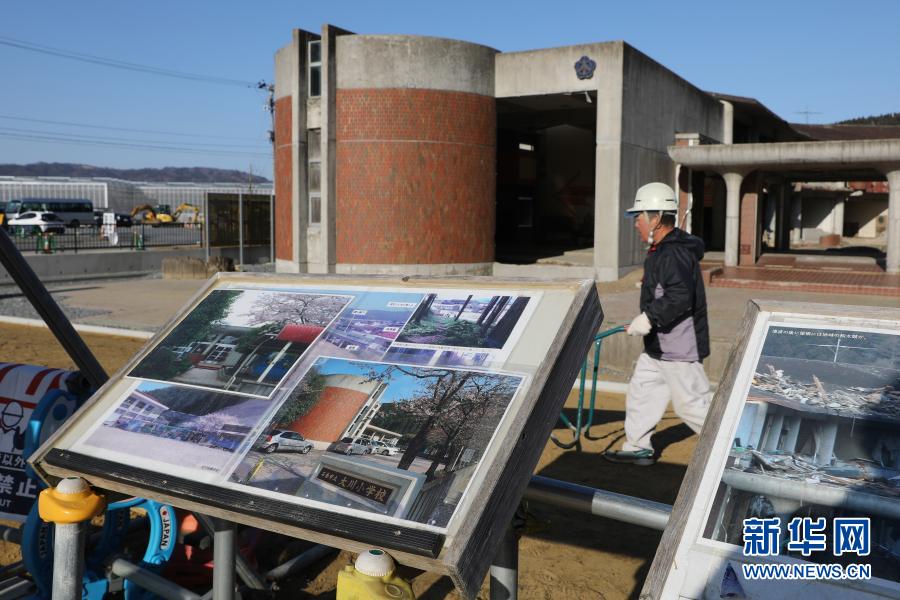 3月9日,日本宮城縣石卷市大川小學遺址前的展板展示受災前的校園景色。新華社記者 杜瀟逸 攝