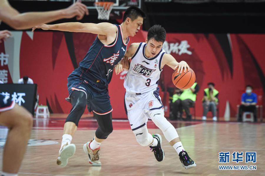 3月14日,時(shí)代中國廣州隊(duì)球員賈明儒(右)在比賽中突破廣東東莞大益隊(duì)球員周鵬的防守。 當(dāng)日,在浙江諸暨舉行的2020-2021賽季中國男子籃球職業(yè)聯(lián)賽(CBA)第三階段第46輪比賽中,廣東東莞大益隊(duì)以110比104戰(zhàn)勝時(shí)代中國廣州隊(duì)。 新華社記者 江漢 攝