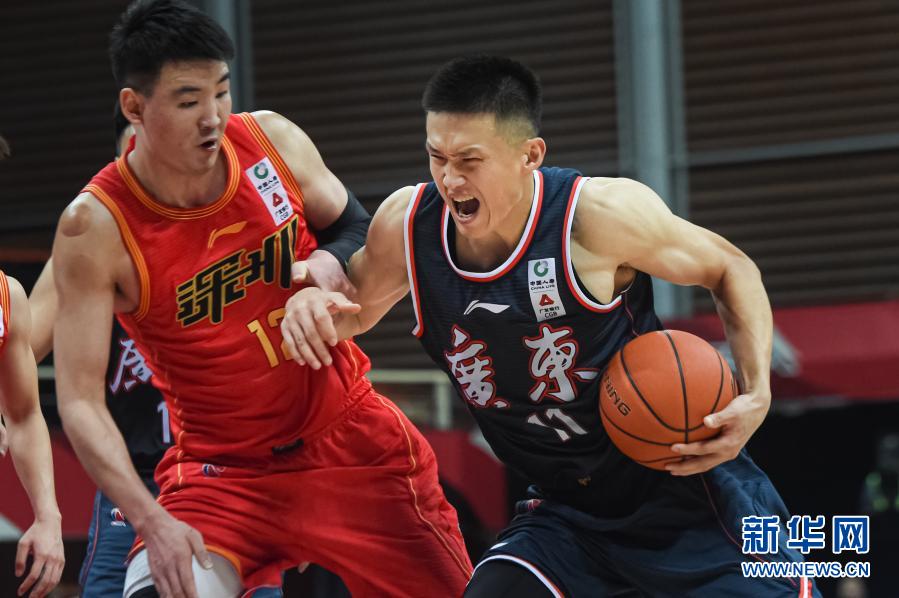 3月17日,廣東東莞大益隊球員周鵬(右)在比賽中突破深圳馬可波羅隊球員顧全的防守。