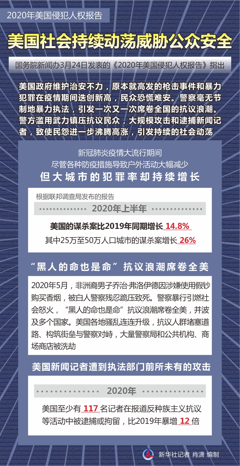 新華社北京3月24日電 國務院新聞辦24日發表的《2020年美國侵犯人權報告》指出,美國社會持續動蕩威脅公眾安全。