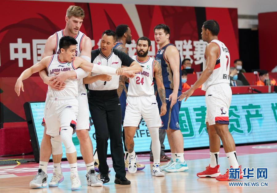 3月24日,與南京同曦宙光隊球員王旭發生沖突后,隊友和裁判安撫時代中國廣州隊球員陳盈駿(左一)。