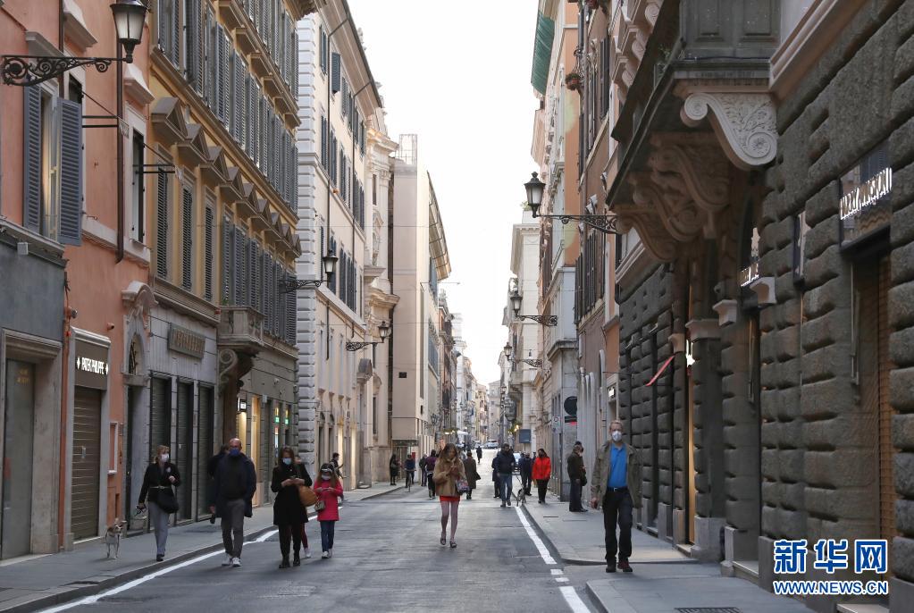 3月27日,人們走在意大利首都羅馬的孔多蒂街上。 根據意衛生部27日公布的數字,該國當日新增新冠確診病例23839例,累計確診病例3512453例。 新華社記者 程婷婷 攝