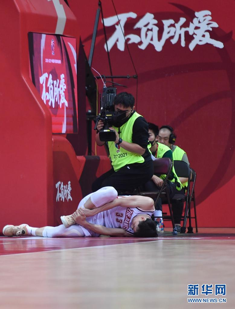 3月29日,浙江稠州金租隊球員吳前(下)在比賽中受傷倒地,隨后無法堅持比賽離場。