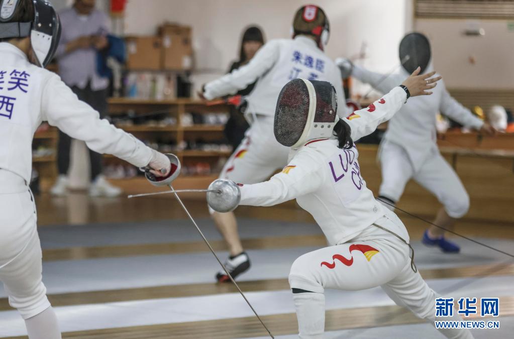 這是江蘇省擊劍隊隊員駱曉娟(前右)與隊友在南京體育學院內訓練(3月29日攝)。