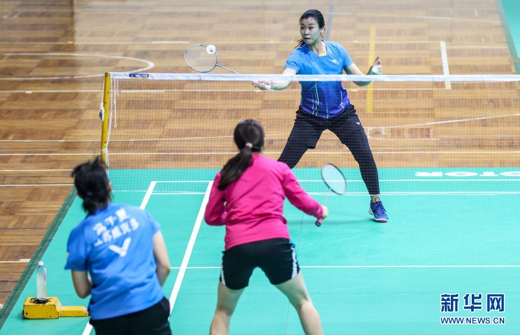 這是江蘇羽毛球運動員湯金華(上)與隊友在訓練中(3月29日攝)。