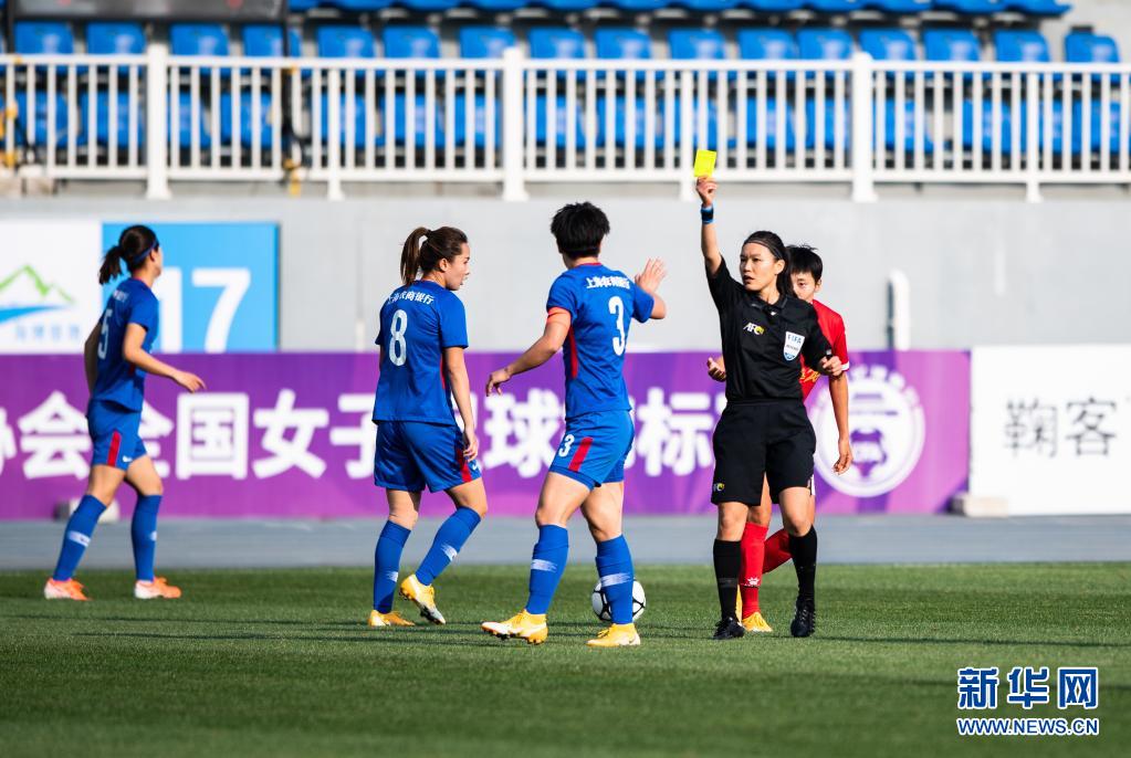 4月7日,裁判向上海農(nóng)商銀行隊球員劉潔茹(左三)出示黃牌。 當日,在昆明舉行的2021年中國足球協(xié)會全國女子足球錦標賽決賽中,長春大眾置業(yè)隊在常規(guī)時間內(nèi)以1比1戰(zhàn)平上海農(nóng)商銀行隊,最終在點球大戰(zhàn)中以4比1(總比分5比2)戰(zhàn)勝對手,獲得冠軍。 新華社記者 王冠森 攝 |