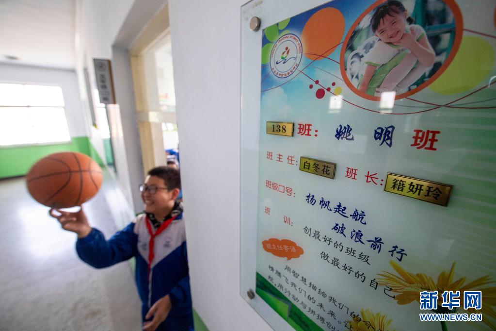 朝陽(yáng)學(xué)校的學(xué)生在課后拿著籃球走出教室(4月14日攝)。新華社記者 楊晨光 攝