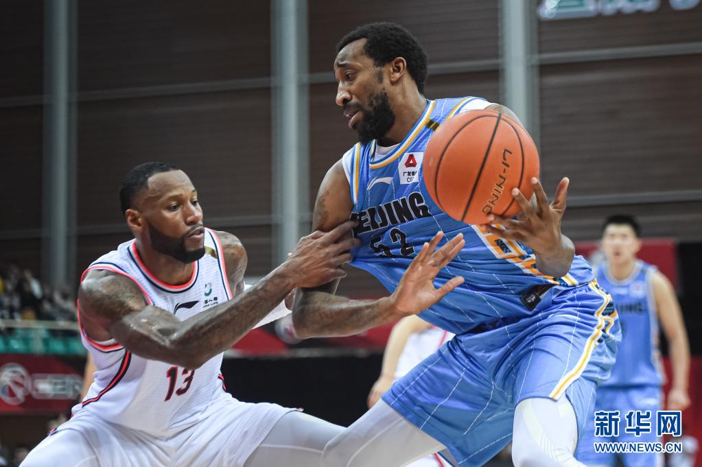 4月18日,廣東東莞大益隊球員威姆斯(左)在比賽中防守北京首鋼隊球員邁克瑞。