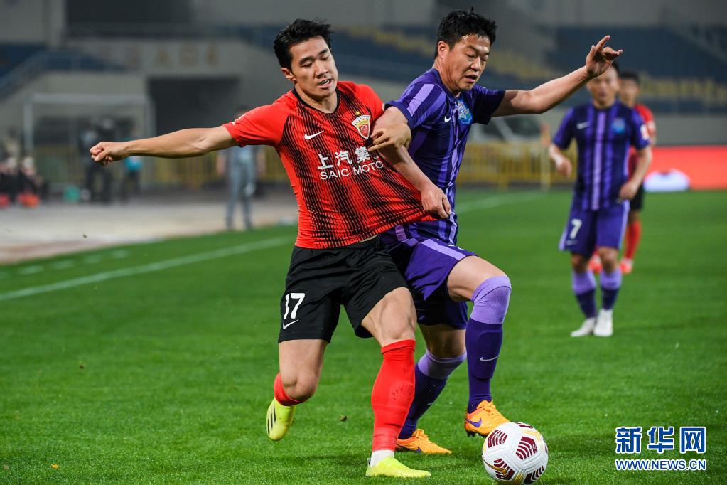 4月22日,上海海港隊球員陳彬彬(左)在比賽中拼搶。