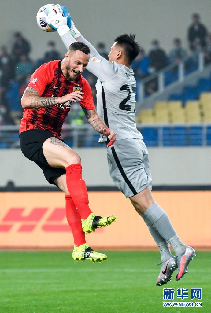 4月22日,天津津門虎隊守門員滕尚坤(右)與上海海港隊球員阿瑙托維奇在比賽中拼搶。